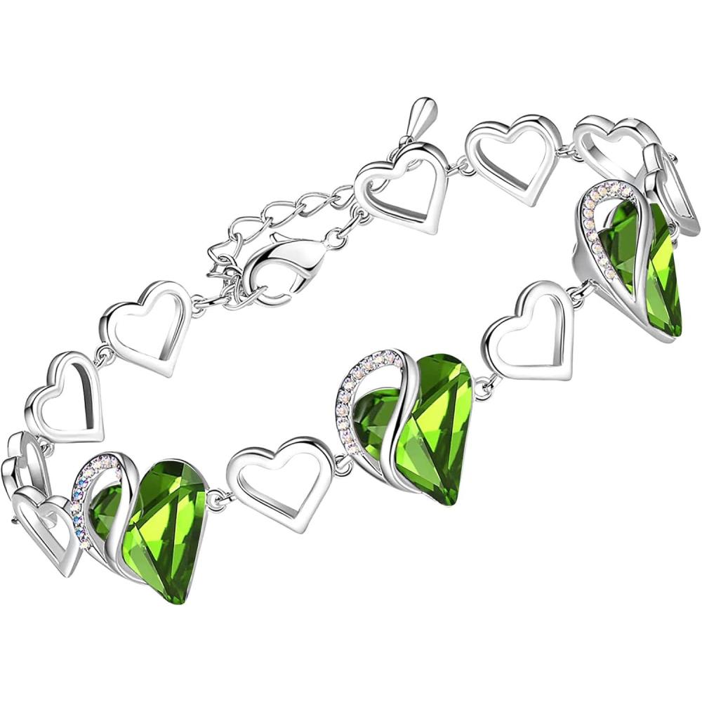 Leafael Infinity Love Heart Link Bracelets, Birthstone or Healing Stone Crystal Bracelet for Women, Silver Tone Jewelry Gifts for Her, 7-inch Chain and 2-inch Extender(08-August-Peridot Green)