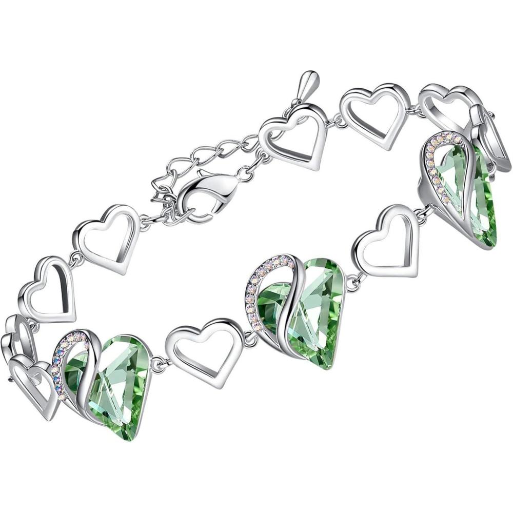 Leafael Infinity Love Heart Link Bracelets, Birthstone or Healing Stone Crystal Bracelet for Women, Silver Tone Jewelry Gifts for Her, 7-inch Chain and 2-inch Extender(08b-August-Healing Stone for Confidence-Light Chrysolite Green)