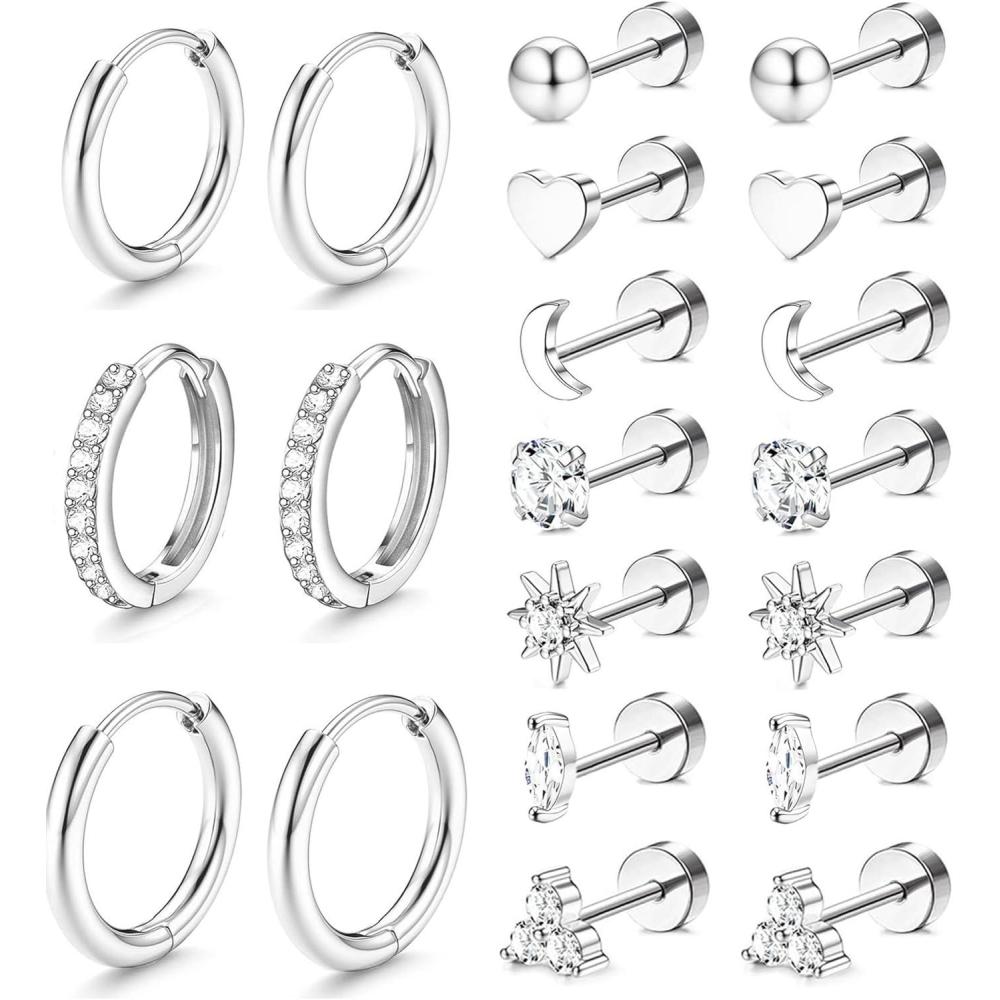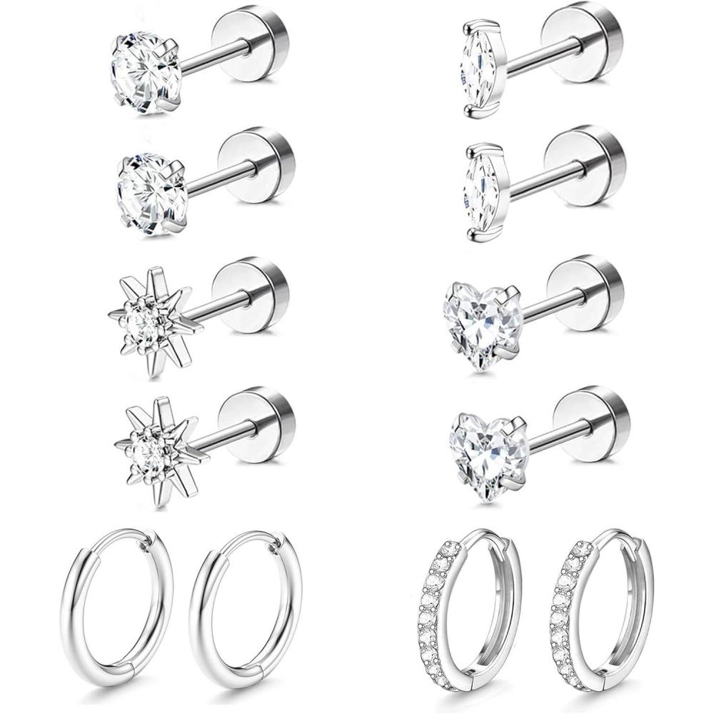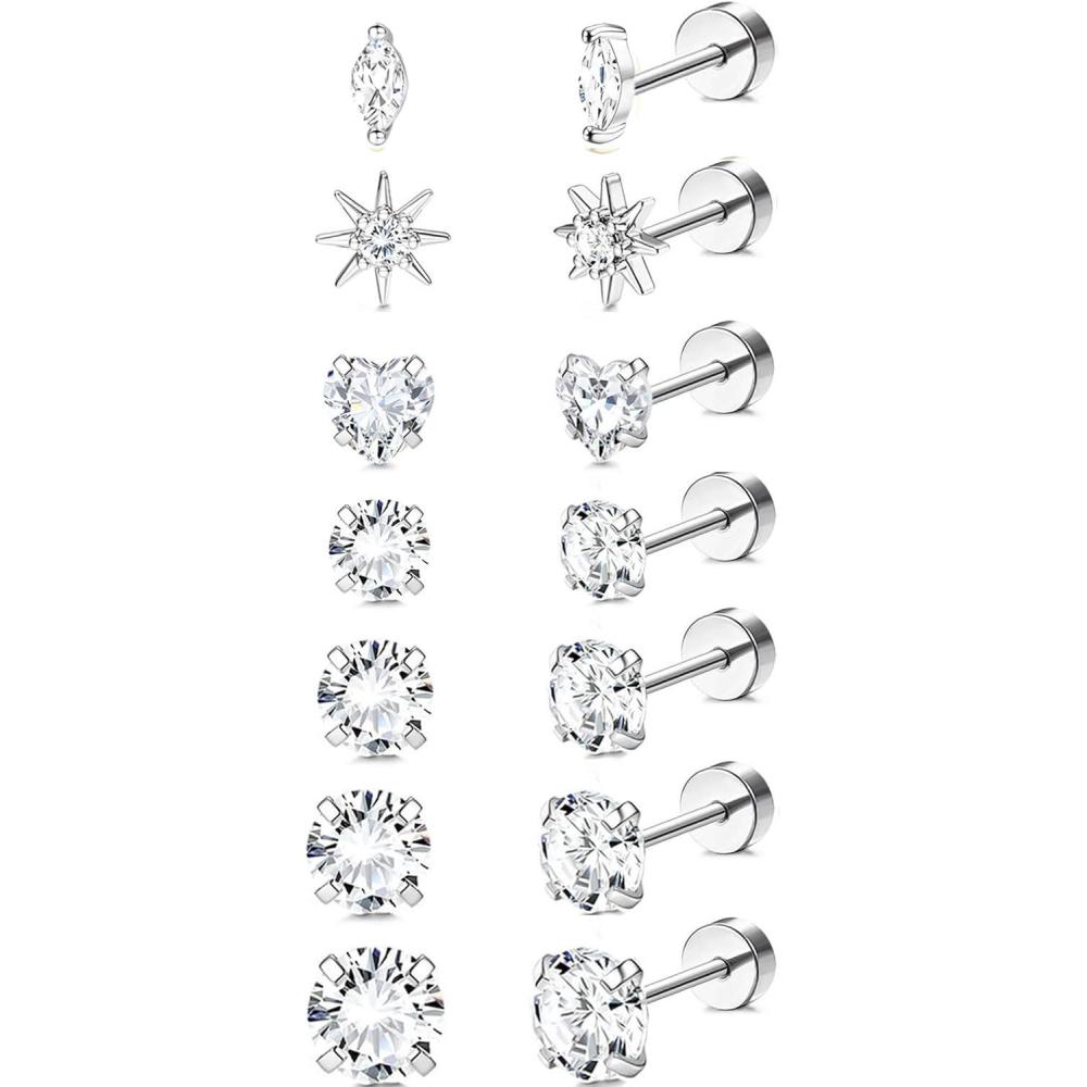 Incaton Hypoallergenic Flat Back Earrings for Women Silver 14K Gold Plated Surgical Stainless Steel Stud Earrings Cubic Zirconia Cartilage Studs Earrings For Multiple Piercing Sensitive Ears(1-SILVER)
