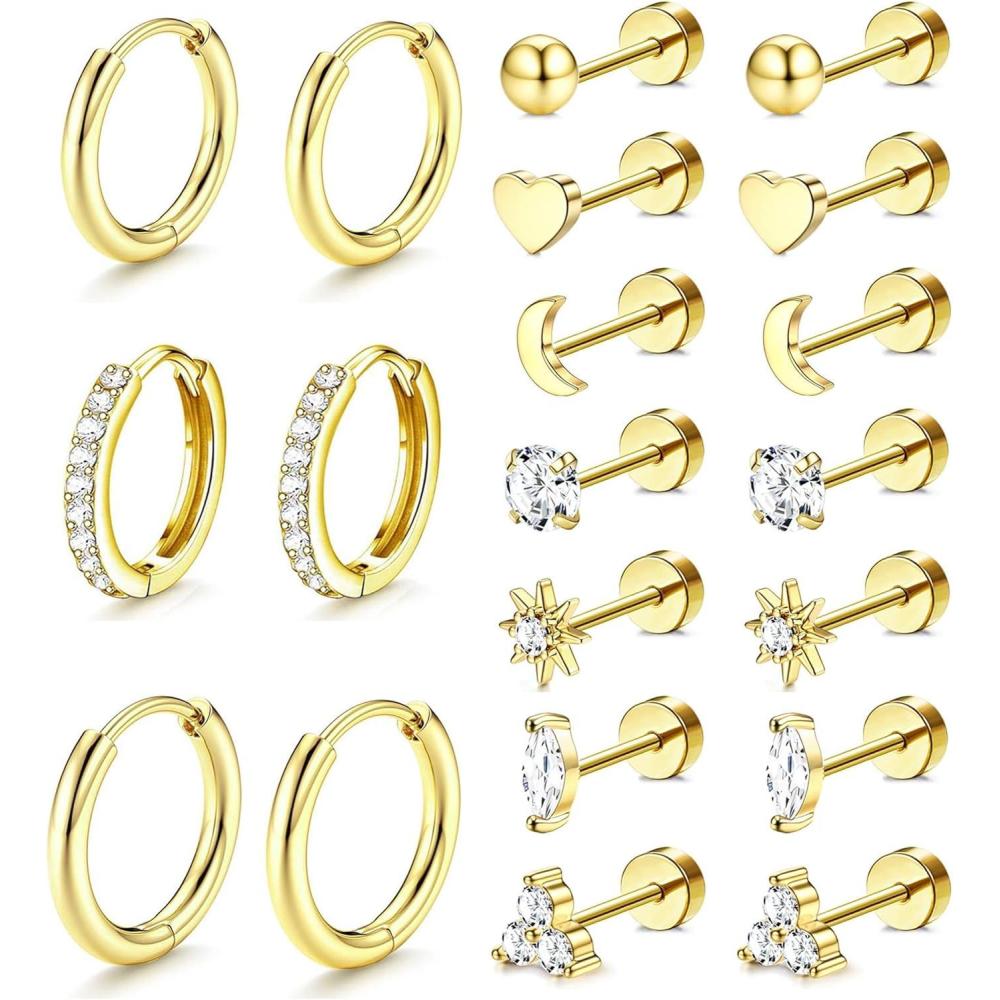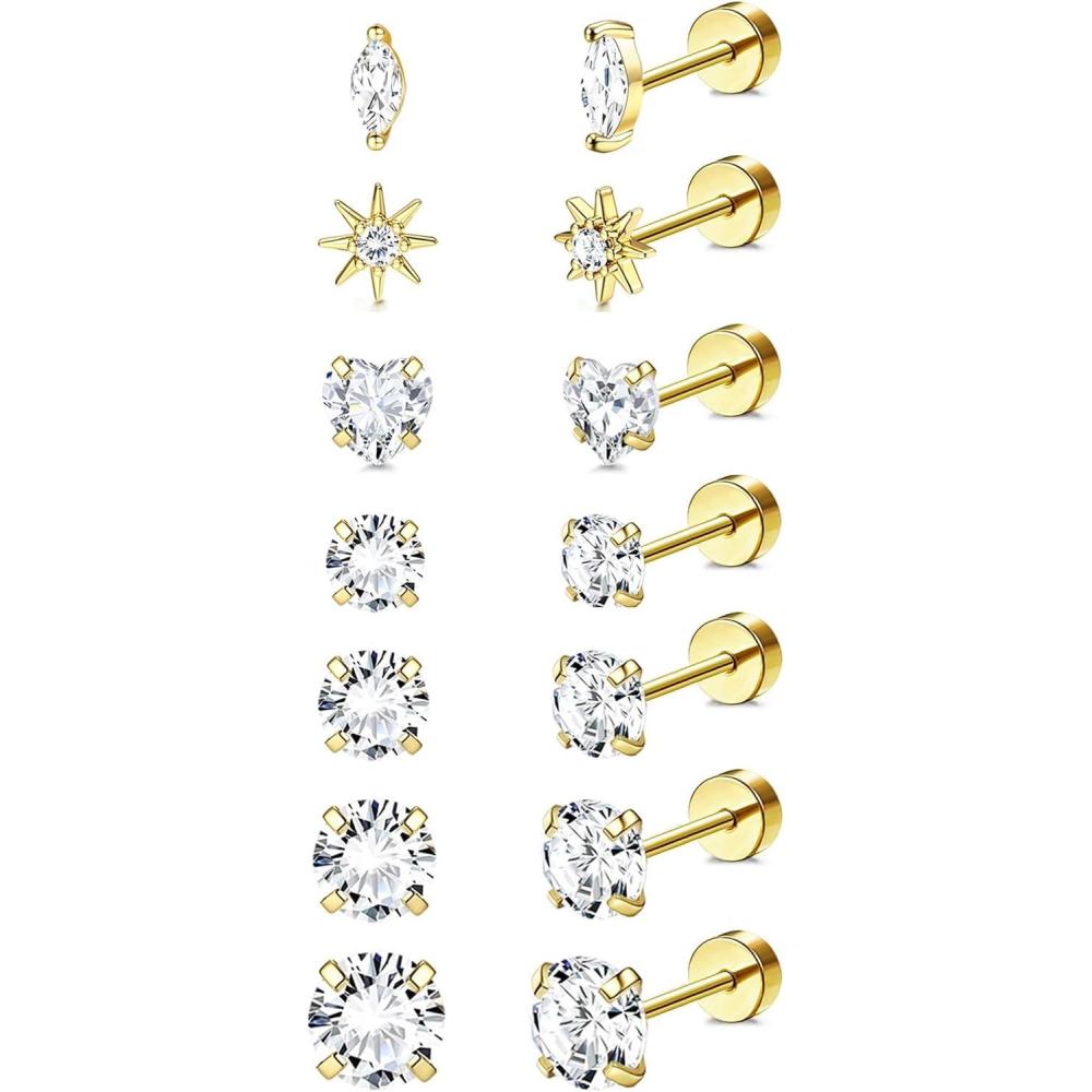 Incaton Hypoallergenic Flat Back Earrings for Women Silver 14K Gold Plated Surgical Stainless Steel Stud Earrings Cubic Zirconia Cartilage Studs Earrings For Multiple Piercing Sensitive Ears(1-GOLD)