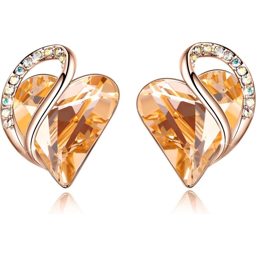 Leafael 18K Rose Gold Plated Love Heart Stud Earrings with Healing Stone Crystal Jewelry Gifts for Women(Happiness Healing Stone – Citrine Golden Yellow Crystal)