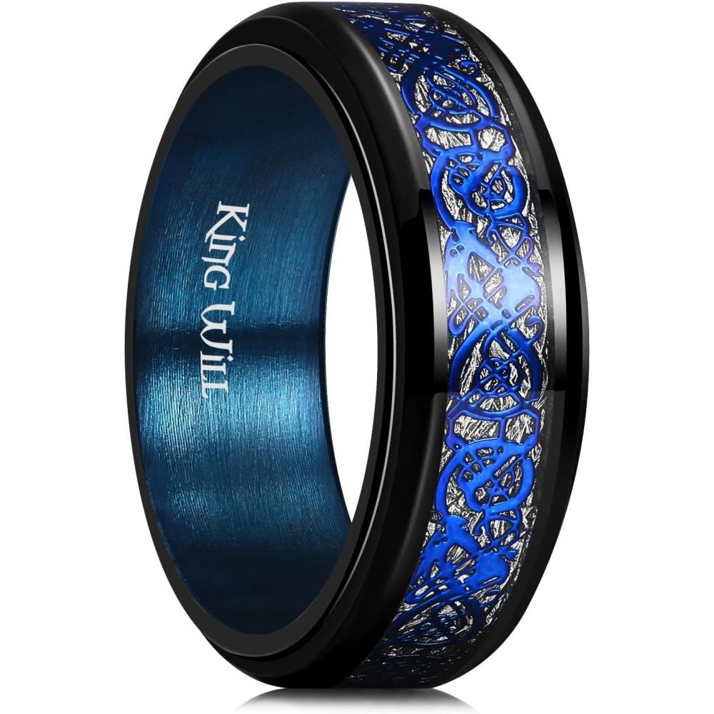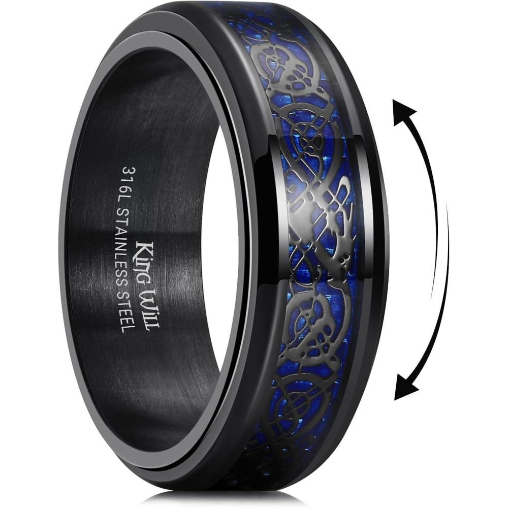King Will 316L Stainless Steel Spinner Ring for Men Women- 8mm Width Black/Silver Fidget Ring with Dragon/Celtic Knot Pattern, Stress Anxiety Relief Comfort Fit Wedding Band Size 6-14(Black-Dark Blue)