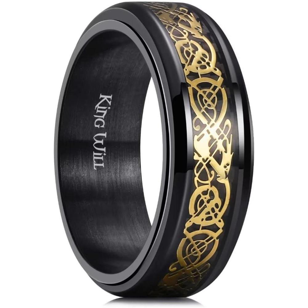 King Will 316L Stainless Steel Spinner Ring for Men Women- 8mm Width Black/Silver Fidget Ring with Dragon/Celtic Knot Pattern, Stress Anxiety Relief Comfort Fit Wedding Band Size 6-14(Black-Gold)