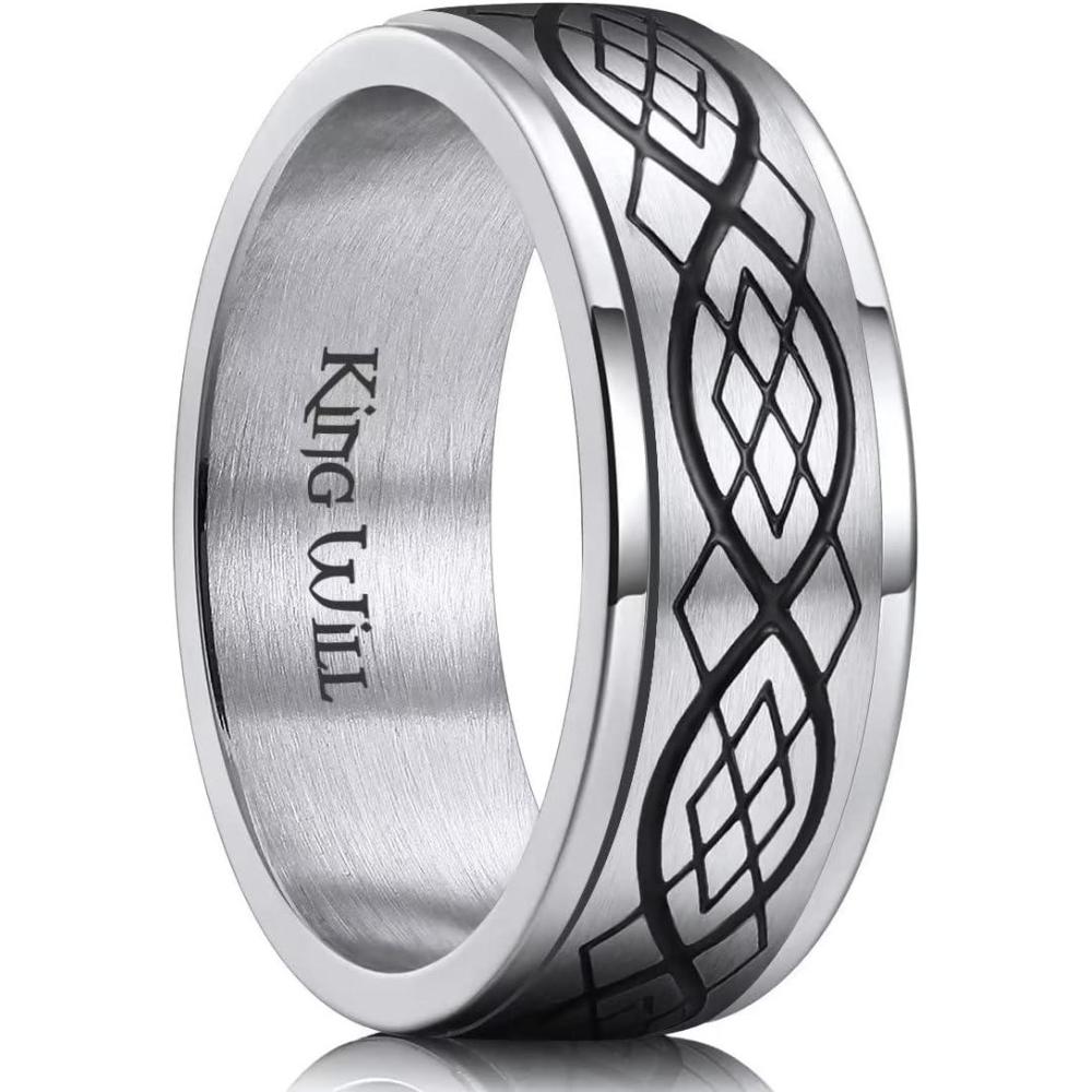 King Will 316L Stainless Steel Spinner Ring for Men Women- 8mm Width Black/Silver Fidget Ring with Dragon/Celtic Knot Pattern, Stress Anxiety Relief Comfort Fit Wedding Band Size 6-14(Black-Wood)
