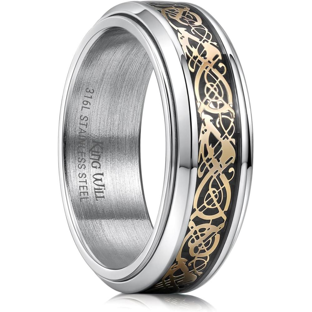 King Will 316L Stainless Steel Spinner Ring for Men Women- 8mm Width Black/Silver Fidget Ring with Dragon/Celtic Knot Pattern, Stress Anxiety Relief Comfort Fit Wedding Band Size 6-14(Sliver-Gold)