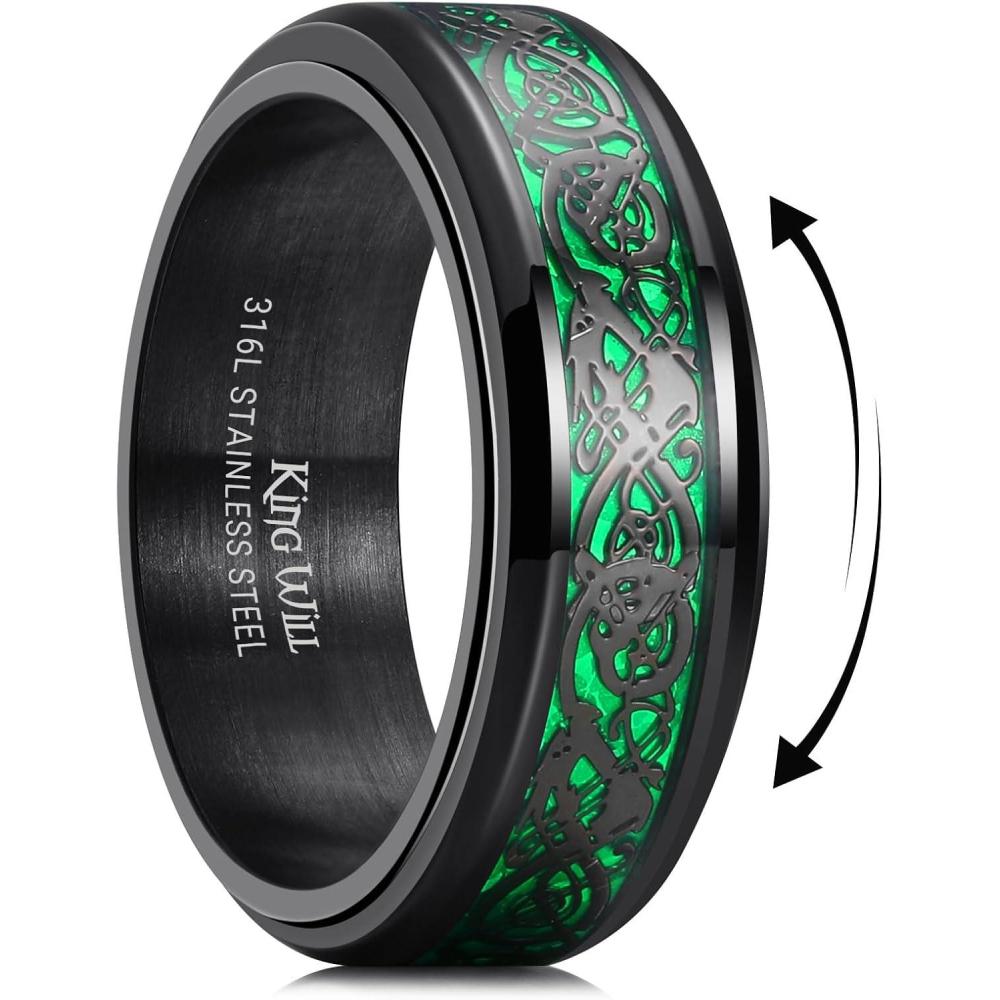 King Will 316L Stainless Steel Spinner Ring for Men Women- 8mm Width Black/Silver Fidget Ring with Dragon/Celtic Knot Pattern, Stress Anxiety Relief Comfort Fit Wedding Band Size 6-14(Black-Green)