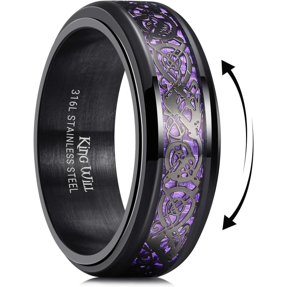 King Will 316L Stainless Steel Spinner Ring for Men Women- 8mm Width Black/Silver Fidget Ring with Dragon/Celtic Knot Pattern, Stress Anxiety Relief Comfort Fit Wedding Band Size 6-14(Black-Purple)