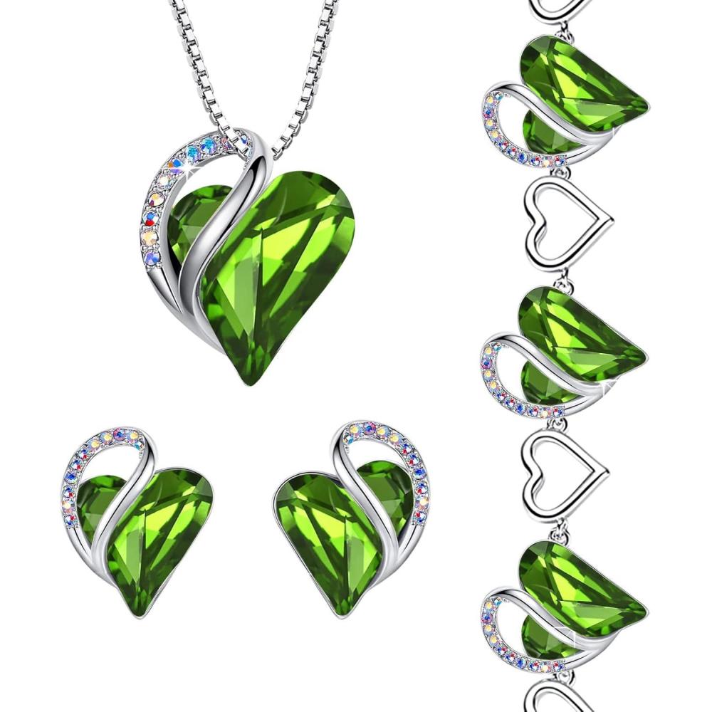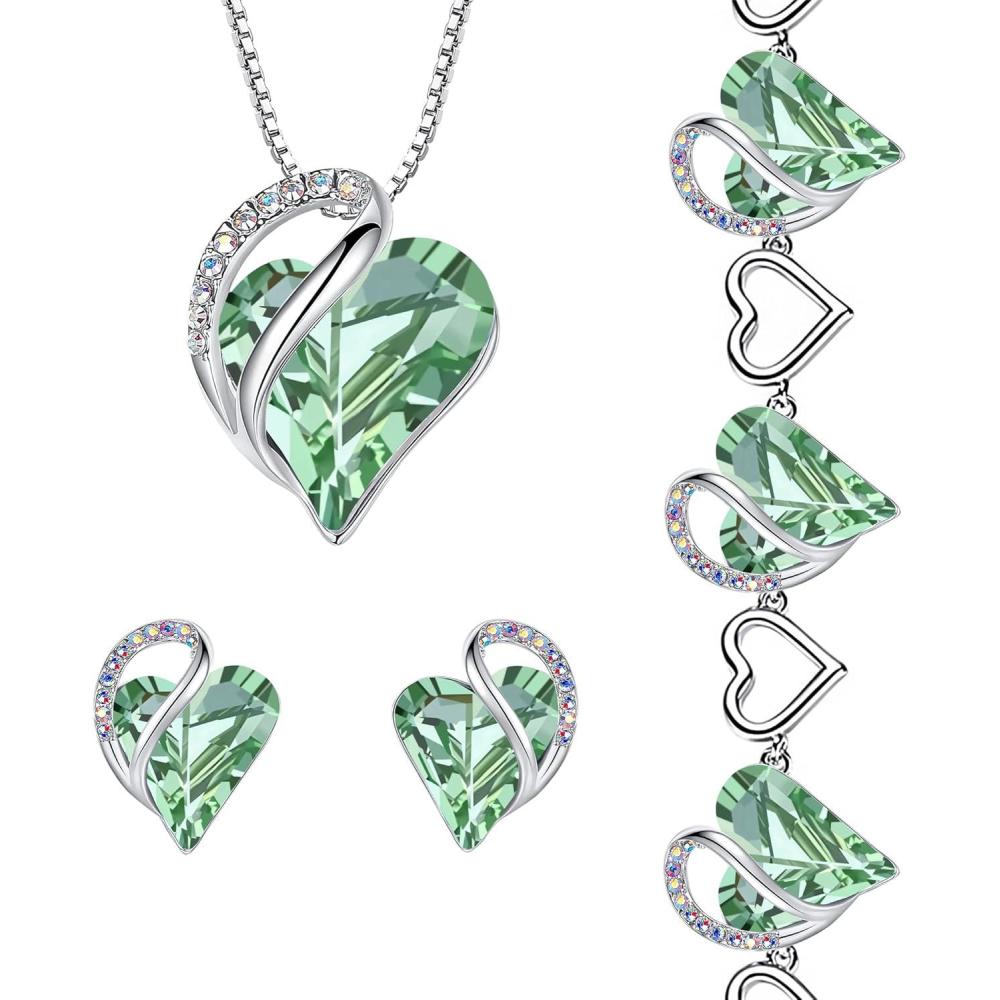 Leafael Infinity Love Heart Necklace, Stud Earrings, and Bracelet for Women, August Birthstone Crystal Jewelry, Silver Tone Gifts for Women, Light Chrysolite Green