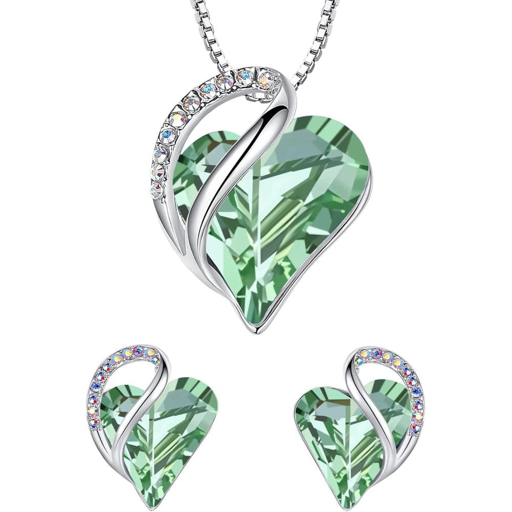 Leafael Infinity Love Heart Necklace and Stud Earrings for Women, August Birthstone Crystal Jewelry, Silver Tone Bundle Gifts for Women, Light Chrysolite Green