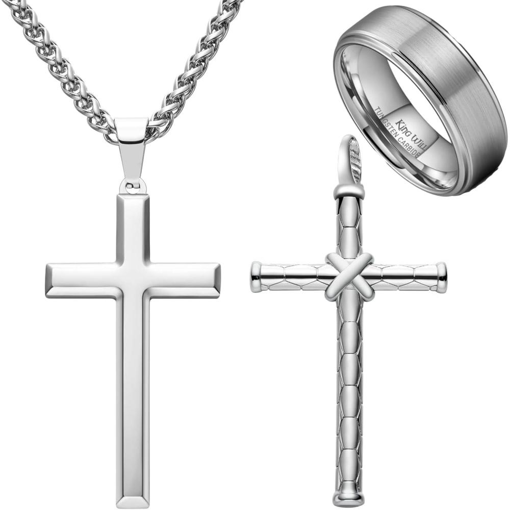 King Will 20″ Stainless Steel Necklace with Two Alternative Pendants, Cross Pendent/National Flag Style, Silver – Three Ways to Wear, Necklace Only/With Pendaent/With Ring (Not Include)(Cross)