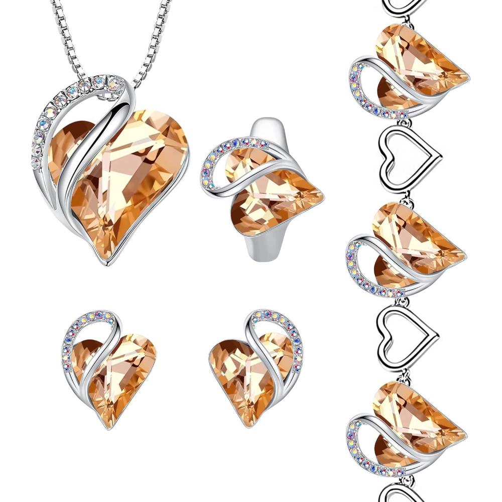Leafael Infinity Love Heart Necklace, Stud Earrings, and Bracelet for Women, Healing Stone for Energy Crystal Jewelry, Silver Tone Gifts for Women, Carnelian Orange