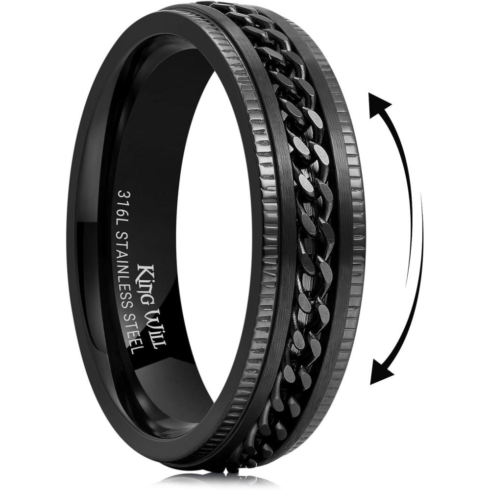 King Will 316L Stainless Steel Fidget Ring for Men Women-8mm Width with Stylish Chain Inlay Spinner Ring Stress Relief, Durable Wedding Band Comfort Fit Size 4-16(A-Black-6mm)