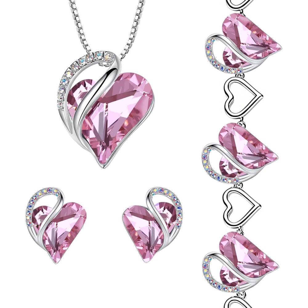 Leafael Infinity Love Heart Necklace, Stud Earrings, and Bracelet for Women, October Birthstone Crystal Jewelry, Silver Tone Gifts for Women, Rose Quartz Pink