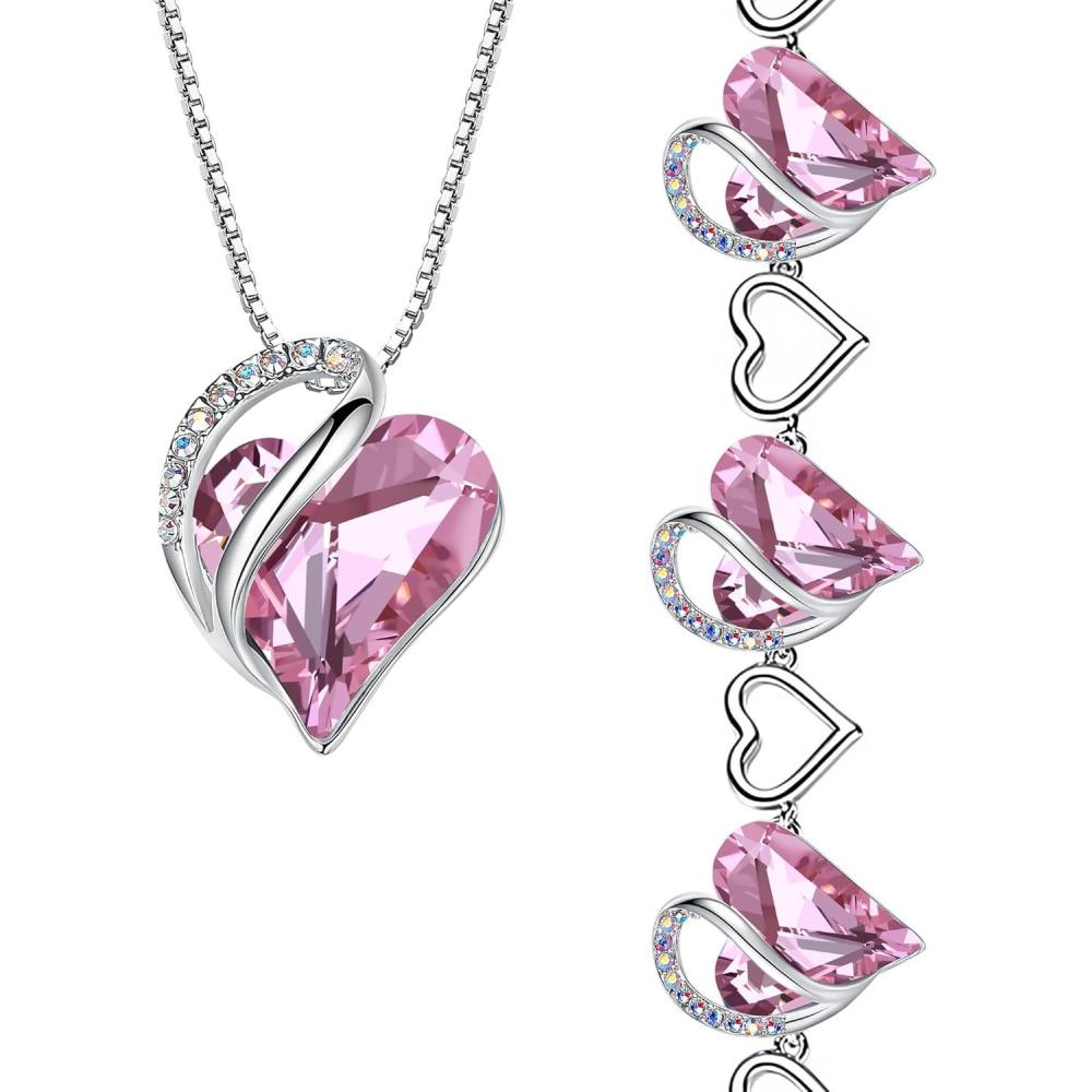 Leafael Infinity Love Heart Necklace and Bracelet for Women, October Birthstone Crystal Jewelry, Silver Tone Bundle Gifts for Women, Rose Quartz Pink