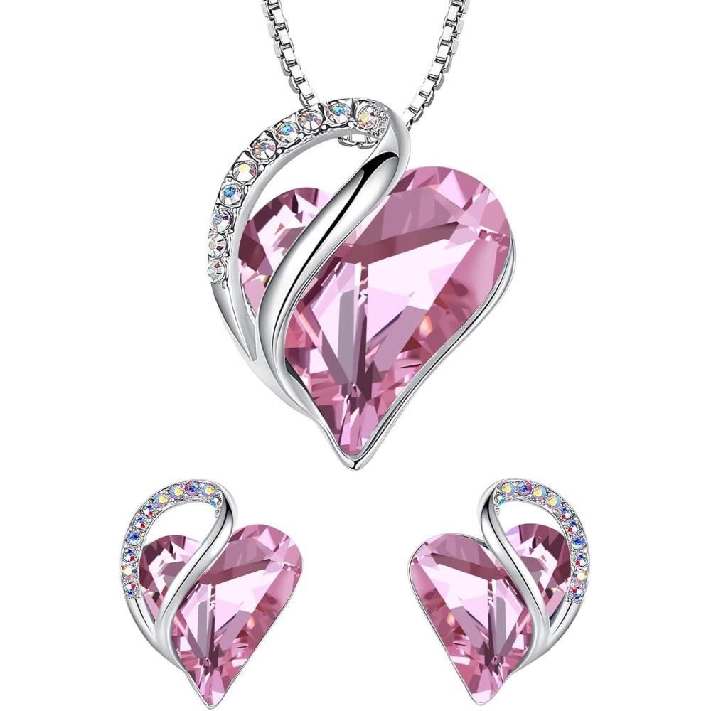 Leafael Infinity Love Heart Necklace and Stud Earrings for Women, October Birthstone Crystal Jewelry, Silver Tone Bundle Gifts for Women, Rose Quartz Pink