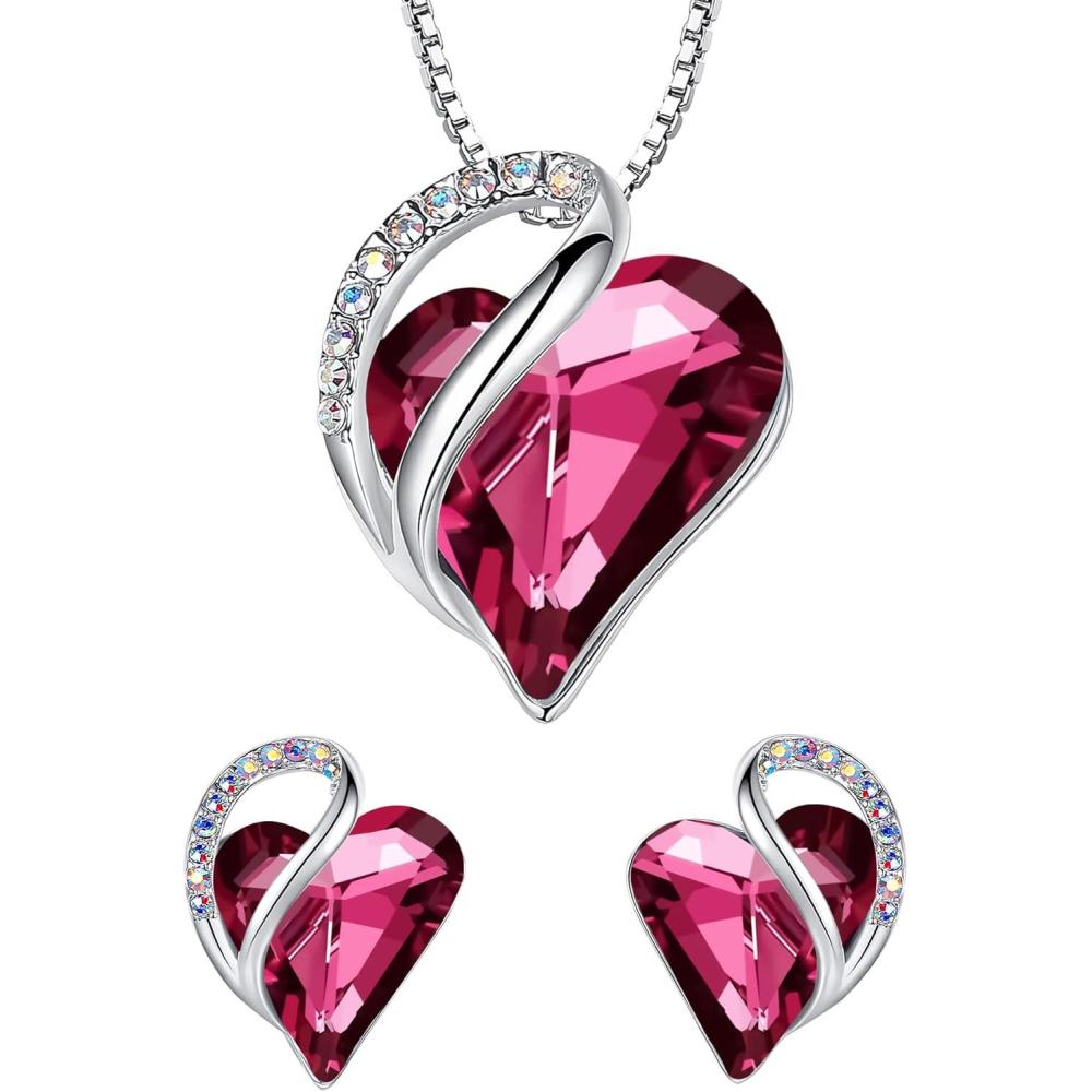 Leafael Infinity Love Heart Necklace and Stud Earrings for Women, October Birthstone Crystal Jewelry, Silver Tone Bundle Gifts for Women, Tourmaline Pink